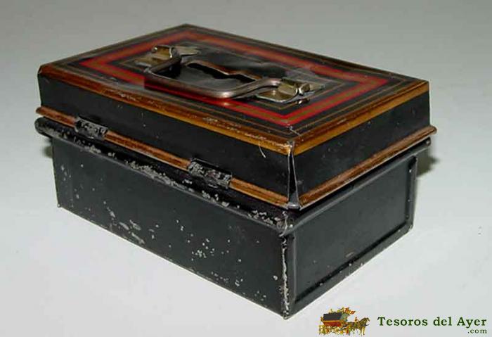 ANTIGUA HUCHA DE PAYA DE HOJALATA LITOGRAFIADA, AÑOS 20 - MIDE 10 X 6,5 X 5 CMS.